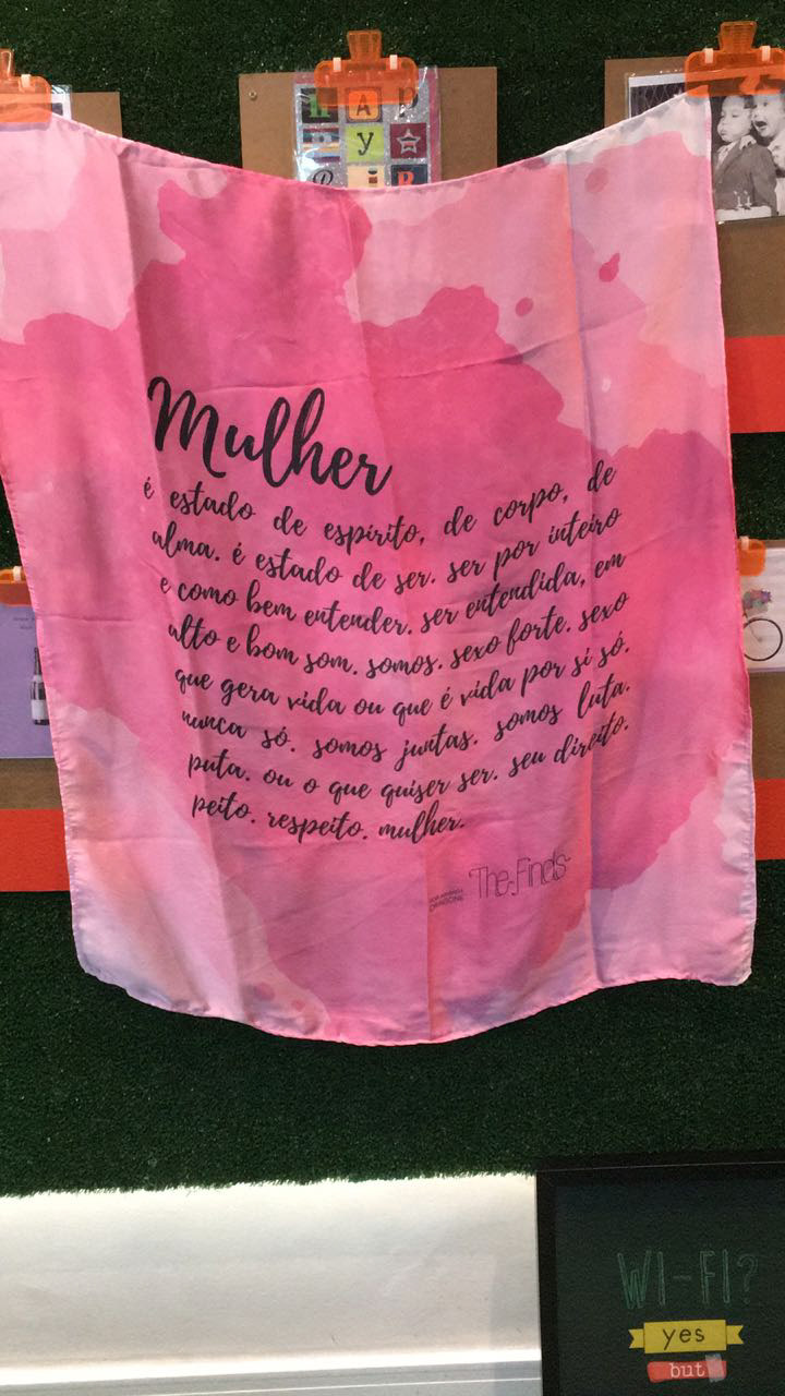 Artes e texto criados para ação promocional do Dia da Mulher da The Finds, onde foi produzindo um lenço como convite para evento da marca. 2018.
